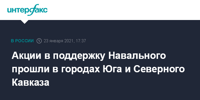 Москва. 23 января. INTERFAX.RU - Жители ряда крупных городов Южного и Северо-Кавказского федеральных округов в субботу приняли участие в несогласованных акциях протеста в поддержку оппозиционера Алексея Навального.