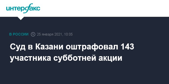 Москва. 25 января. INTERFAX.RU - В минувшие выходные Вахитовский суд Казани рассмотрел 144 административных дела в отношении участников не согласованной акции в поддержку Алексея Навального, вынес 143 штрафа и одно дело закрыл за отсутствием состава преступления, сообщила "Интерфаксу" пресс-секретарь суда Татьяна Салова.