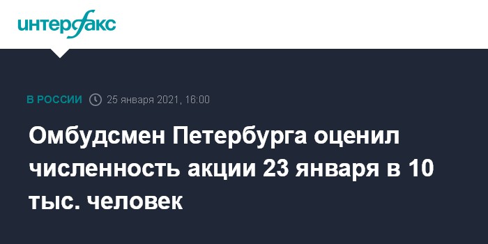 Москва. 25 января. INTERFAX.RU - В несанкционированной протестной акции 23 января в Санкт-Петербурге одновременно принимало участие до 10 тысяч человек, сообщила в понедельник пресс-служба уполномоченного по правам человека в северной столице Александра Шишлова.
