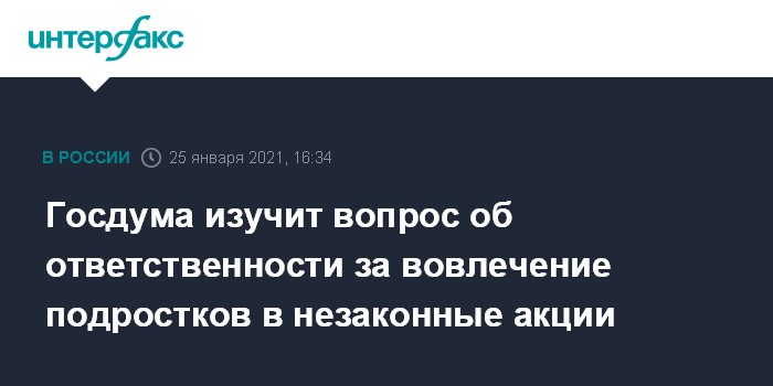 Москва. 25 января. INTERFAX.RU - В Госдуме изучат действующие нормы законодательства об ответственности за вовлечение несовершеннолетних в несанкционированные акции, а также проверят правоприменительную практику, пообещал спикер палаты Вячеслав Володин.
