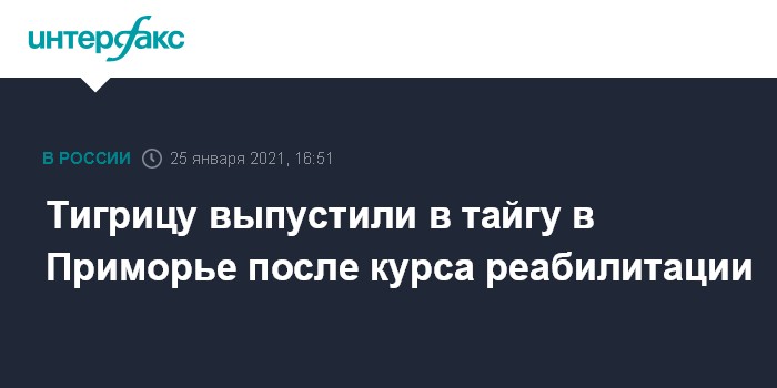 Москва. 25 января. INTERFAX.RU - Амурскую тигрицу выпустили в дикую природу в центральном Приморье после восстановления в Центре реабилитации диких животных "Тигр" в Алексеевке, хищницу снабдили специальным ошейником с GPS модулем.