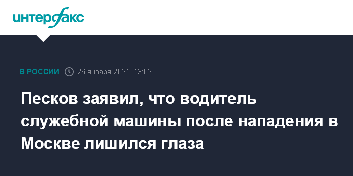 Москва. 26 января. INTERFAX.RU - Водитель служебной машины, на которую 23 января на Трубной площади напали провокаторы, лишился глаза, заявил журналистам пресс-секретарь президента Дмитрий Песков. Ранее о том, что ему выбили глаз, сообщали источники СМИ.