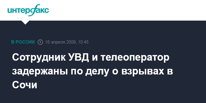 Москва. 16 апреля. INTERFAX.RU - По делу о взрывах в Сочи задержаны два человека - сотрудник УВД города и телеоператор одной из сочинских телекомпаний. "В ходе расследования уголовного дела правоохранительными органами Краснодарского края установлены два лица, причастных к совершению данных преступлений. В настоящее время подозреваемые задержаны", - сообщает пресс-служба СКП РФ.