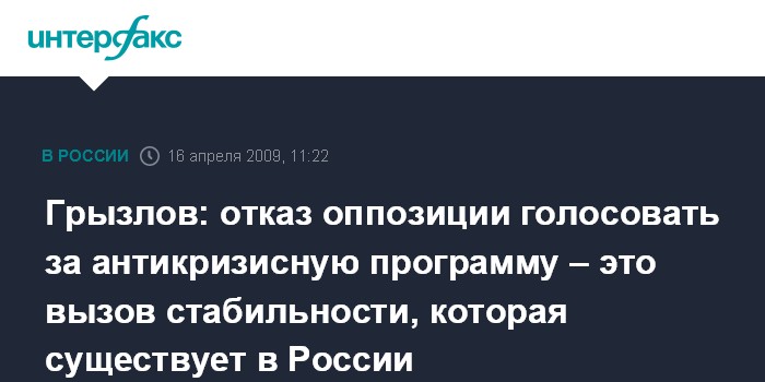 "Считаю, что брошен вызов - вызов со стороны оппозиции тому порядку, той стабильности, которая на сегодняшний день существует", - заявил Б.Грызлов, выразив недоумение в связи с тем, что на заседании в среду все три оппозиционные фракции - КПРФ, ЛДПР и "Справедливая Россия" отказались поддержать антикризисную программу правительства и соответствующие поправки в бюджет текущего года.