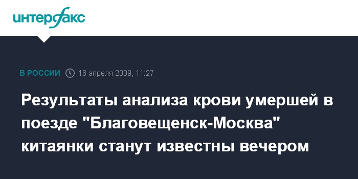 Москва. 16 апреля. INTERFAX.RU - Результаты анализа крови, взятые у гражданки КНР Цуй Цынянь, скончавшейся в поезде "Благовещенск-Москва", будут известны в четверг вечером.
