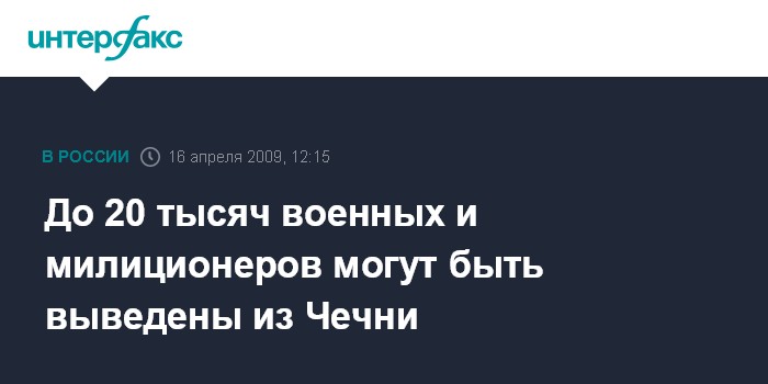 Москва. 16 апреля. INTERFAX.RU - Из Чечни может быть выведено до 20 тысяч милиционеров и сотрудников других российских силовых структур в связи с принятием решения о завершении режима контртеррористической операции в республике.