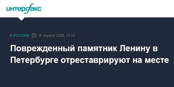 Москва. 16 апреля. INTERFAX.RU - Реставрация памятника Ленину, пострадавшего в результате взрыва, не представляет большой сложности и не потребует демонтажа монумента, сообщила председатель комитета по государственному контролю, использованию и охране памятников истории и культуры Петербурга Вера Дементьева.