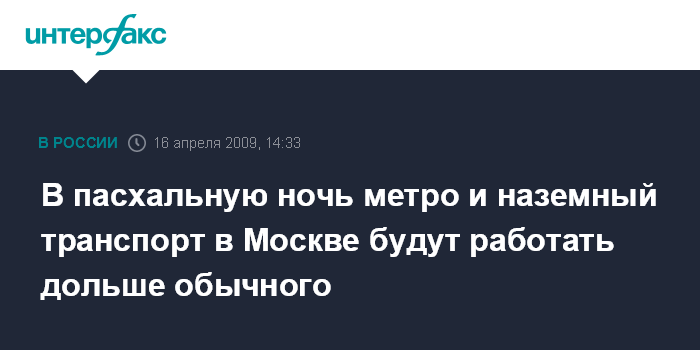 Москва. 16 апреля. INTERFAX.RU - В Москве в связи с массовым посещением храмов в период проведения пасхальных мероприятий и богослужений в ночь с 18 на 19 апреля будет продлено время работы метрополитена и наземного пассажирского транспорта.