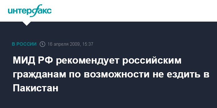 Москва. 16 апреля. INTERFAX.RU - МИД России рекомендует гражданам РФ воздержаться от поездок в Пакистан.