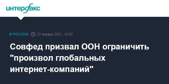 "Проявившаяся в последнее время угроза бесконтрольного доминирования глобальных интернет-компаний делает настоятельно необходимым начало работы над международной конвенцией, регулирующей их деятельность. Целью этой работы должна стать выработка таких общепринятых норм, которые исключат произвольные решения и поставят глобальные интернет-обмены на прочную почву международного права", - говорится в заявлении Совета Федерации, принятом на пленарном заседании палаты в среду.