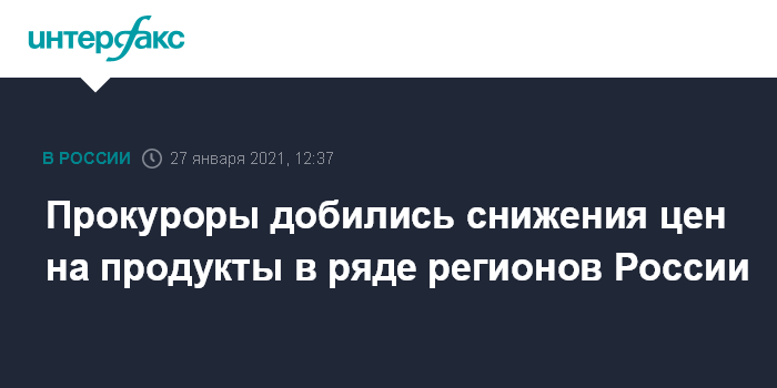 Москва. 27 января. INTERFAX.RU - Прокурорские проверки в регионах России привели к снижению цен на продукты питания, также удалось "предупредить их необоснованный рост", сообщает Генпрокуратура РФ в среду.
