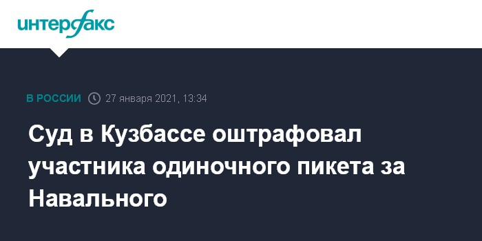 Москва. 27 января. INTERFAX.RU - В Кемеровской области Мариинский городской суд оштрафовал горожанина на 10 000 рублей за проведение одиночного пикета 23 января в поддержку Алексея Навального. Как сообщили в пресс-службе суда, он признан виновным по ч. 1 ст.20.2 КоАП (нарушение порядка проведения акции) в условиях режима повышенной готовности, введенного из-за коронавируса.