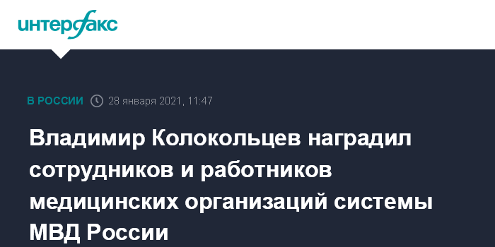 Москва. 28 января. INTERFAX.RU - Министр внутренних дел Российской Федерации генерал полиции Российской Федерации Владимир Колокольцев в режиме видеоконференции провел торжественную церемонию награждения сотрудников и работников ведомственных медицинских организаций.