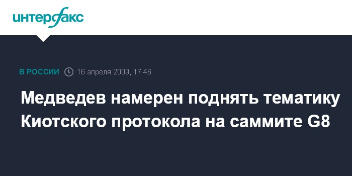 Москва. 16 апреля. INTERFAX.RU - Президент РФ Дмитрий Медведев заявляет, что готов в ходе саммита "большой восьмерки" в Италии переговорить с лидерами ключевых держав на тему присоединения к Киотскому протоколу.