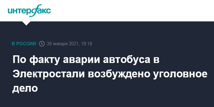 Москва. 28 января. INTERFAX.RU - В Подмосковье возбуждено уголовное дело по факту аварии в Электростали, где утром 21 января пассажирский автобус врезался в здание кинотеатра. Дело расследуется по статье об оказании услуг, не отвечающих требованиям безопасности (ч.1 ст. 238 УК), сообщили в региональной прокуратуре.