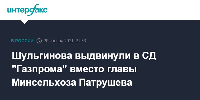 Шульгинова выдвинули в СД "Газпрома" вместо главы Минсельхоза Патрушева