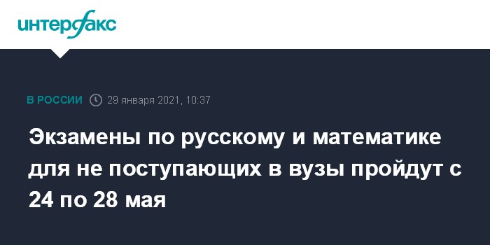 Москва. 29 января. INTERFAX.RU - Государственный выпускной экзамен по русскому языку и математике для выпускников школ, не планирующих поступление в вузы, пройдет с 24 по 28 мая, дополнительный - с 3 по 17 сентября, сообщает Рособрнадзор.