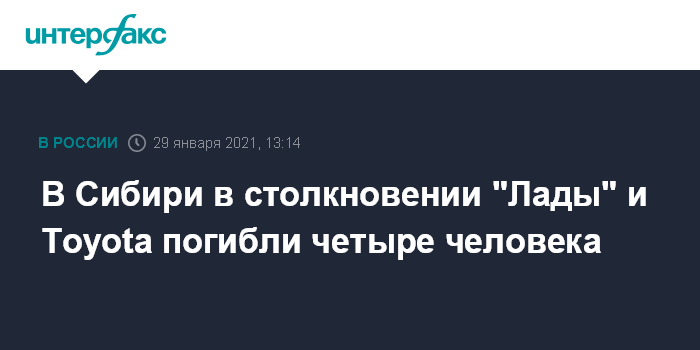Москва. 29 января. INTERFAX.RU - В Абанском районе Красноярского края столкнулись "Лада" и Toyota, в "Ладе" погибли четыре человека, сообщили в управлении МВД по региону.