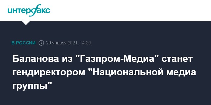 Москва. 29 января. INTERFAX.RU - Новым генеральным директором "Национальной медиа группы" (НМГ) станет бывший первый замглавы "Газпром-медиа" Светлана Баланова, сообщили "Интерфаксу" в пресс-службе НМГ.