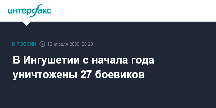Назрань. 16 апреля. INTERFAX.RU - В Ингушетии с начала 2009 г. в ходе проведения различных совместных мероприятий при оказании вооруженного сопротивления уничтожены 27 участников и лидеров незаконных вооруженных формирований, сообщил замглавы МВД Ингушетии Вадим Селиванов.