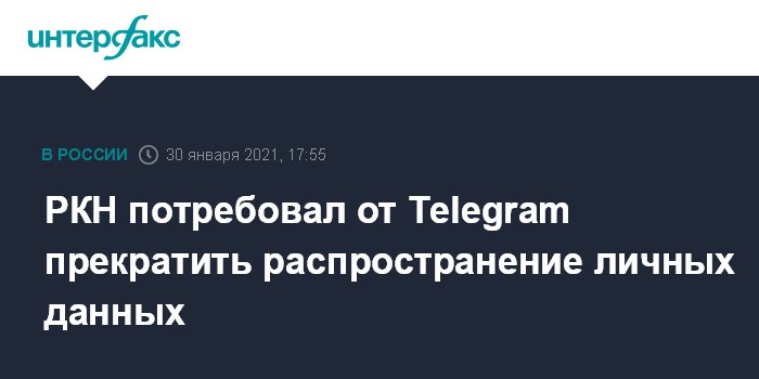 Москва. 30 января. INTERFAX.RU - Роскомнадзор потребовал от мессенджера Telegram прекратить незаконное распространение персональных данных граждан, сообщили в пресс-службе ведомства.