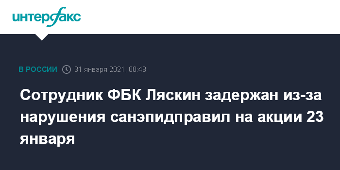 Москва. 31 января. INTERFAX.RU - Сотрудника Фонда борьбы с коррупцией (ФБК, признан в РФ иностранным агентом) Николая Ляскина задержали по уголовному делу о нарушении санитарно-эпидемиологических правил в ходе акции 23 января.
