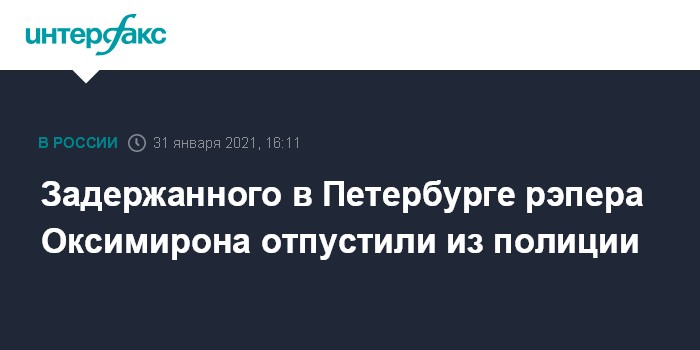 Москва. 31 января. INTERFAX.RU - Полиция отпустила из отдела рэпера Оксимирона (Мирон Федоров), который был задержан в центре Петербурга во время несанкционированной акции протеста, сообщается в воскресенье в телеграм-канале правозащитной организации "Правозащита Открытки".
