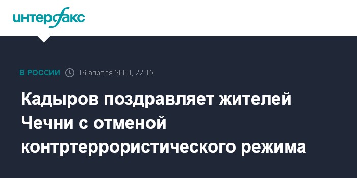 Грозный. 16 апреля. ИНТЕРФАКС - Президент Чеченской республики Рамзан Кадыров поздравил жителей республики с отменой режима контртеррористической операции.