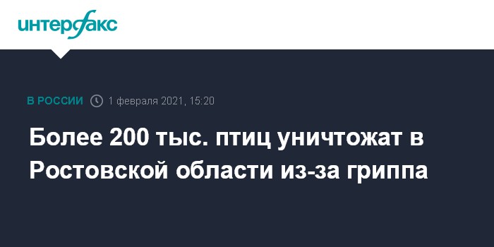 Сообщалось также, что в конце октября 2020 года грипп птиц был выявлен в ОАО "Птицефабрика Таганрогская" в Неклиновском районе области. В том же районе с 5 ноября введен режим ЧС в связи с выявлением очага птичьего гриппа в одном из личных подсобных хозяйств (ЛПХ).