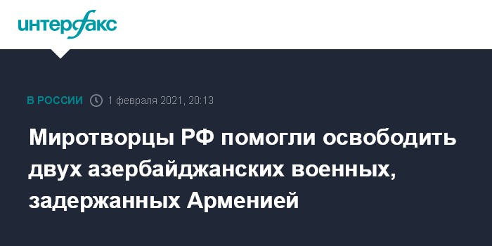 "При посредничестве командования российского миротворческого контингента освобождены двое военнослужащих вооруженных сил Азербайджанской Республики, задержанные 30 января 2021 г. Службой национальной безопасности Республики Армения в районе населенного пункта Тех Сюникской области Республики Армения", - сообщили в военном ведомстве РФ.