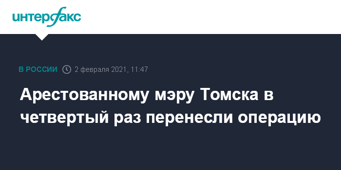 Москва. 2 февраля. INTERFAX.RU - Томский НИИ онкологии запланировал прооперировать арестованного мэра Томска Ивана Кляйна, обвиняемого в превышении полномочий и незаконном предпринимательстве, но операция уже четыре раза переносилась, сообщила во вторник "Интерфаксу" его адвокат Марина Вихлянцева.