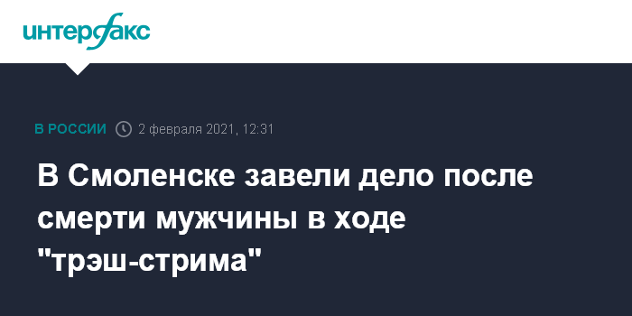 Москва. 2 февраля. INTERFAX.RU - Смоленские следователи по материалам СМИ возбудили уголовное дело по факту смерти мужчины в прямом эфире так называемого трэш-стрима, сообщает СУ СКР по региону во вторник.
