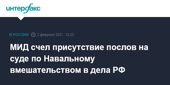 Москва. 2 февраля. INTERFAX.RU - В МИД РФ рассматривают прибытие западных дипломатов на заседание суда по делу оппозиционера Алексея Навального как вмешательство во внутренние дела и проявление попыток сдерживания России.