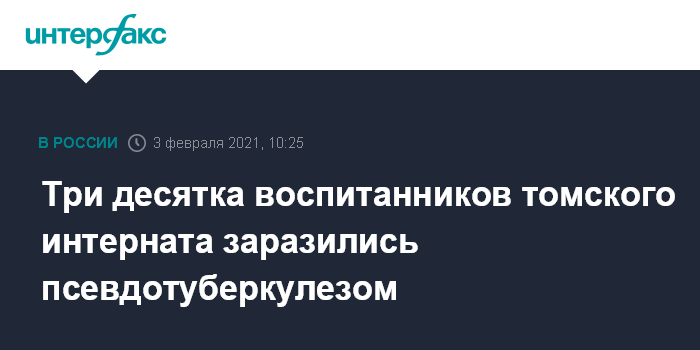 Москва. 3 февраля. INTERFAX.RU - В Томской области 30 воспитанников интерната для детей с ограниченными возможностями здоровья в деревне Крыловка заразились псевдотуберкулезом, сообщили в региональном управлении Роспотребнадзора. Дети были госпитализированы к 2 февраля. Источник инфекции ищут.