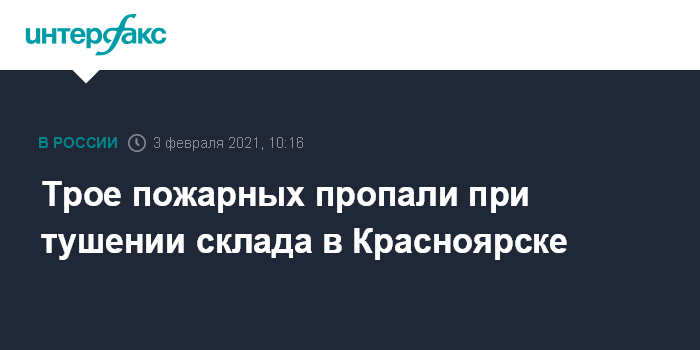 Москва. 3 февраля. INTERFAX.RU - Судьба троих пожарных неизвестна, после того как связь с ними была потеряна при тушении пожара на складе автозапчастей в Красноярске, сообщили в пресс-службе МЧС РФ журналистам в среду.