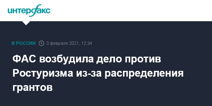 Москва. 3 февраля. INTERFAX.RU - Федеральная антимонопольная служба завела дело на Ростуризм из-за конкурса на получение грантов для развития внутреннего туризма. В Ростуризме говорят, что грантовая программа отвечала всем требованиям прозрачности и открытости.
