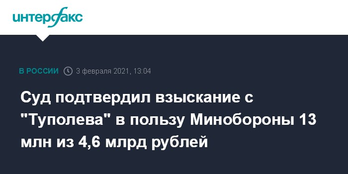 Девятый арбитражный апелляционный суд 6 октября 2020 года подтвердил постановление Арбитражного суда Москвы, который 8 июля частично удовлетворил иск Минобороны и взыскал с ПАО "Туполев" 13 млн рублей из требуемых 4,6 млрд рублей неустойки.