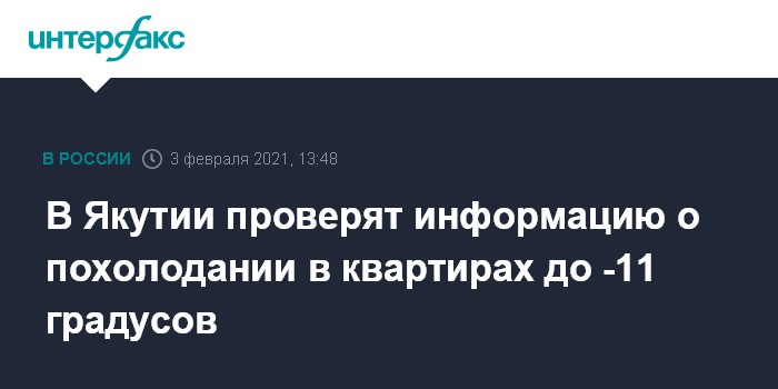 Москва. 3 февраля. INTERFAX.RU - В Якутии начата процессуальная проверка после сообщения СМИ о том, что в квартирах дома в городе Томмоте температура опустилась до минус 11 градусов, сообщает пресс-служба управления СК РФ по республике.