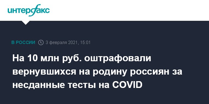 На 10 млн руб. оштрафовали вернувшихся на родину россиян за несданные тесты на COVID