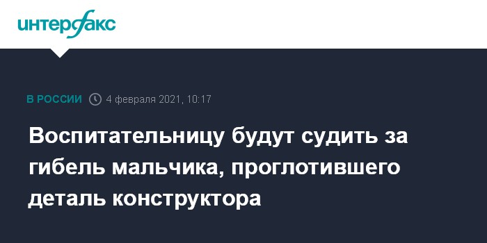Москва. 4 февраля. INTERFAX.RU - Борский суд Самарской области рассмотрит дело о гибели четырехлетнего мальчика, который поперхнулся деталью от конструктора в детском садике. Судить будут воспитательницу, сообщили в пресс-службе СКР.