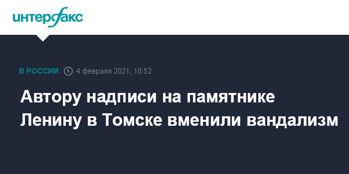 Москва. 4 февраля. INTERFAX.RU - В Томске дознаватели МВД Ленинского района возбудили уголовное дело о вандализме в связи с появлением на памятнике Ленину надписи против президента. Об этом сообщили в пресс-службе областного управления МВД.