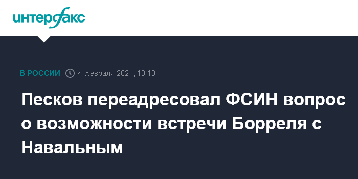 Москва. 4 февраля. INTERFAX.RU - Пресс-секретарь президента РФ Дмитрий Песков переадресовал в Федеральную службу исполнения наказаний (ФСИН) вопрос о возможности встречи высокого представителя ЕС по иностранным делам Жозепа Борреля с осужденным оппозиционером Алексеем Навальным, отметив, что у Кремля нет позиции по этому вопросу.
