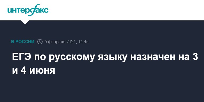 Москва. 5 февраля. INTERFAX.RU - Единый госэкзамен (ЕГЭ) по русскому языку пройдет 3 и 4 июня, его сдают все выпускники, собирающиеся поступать в вузы, сообщает Рособрнадзор.