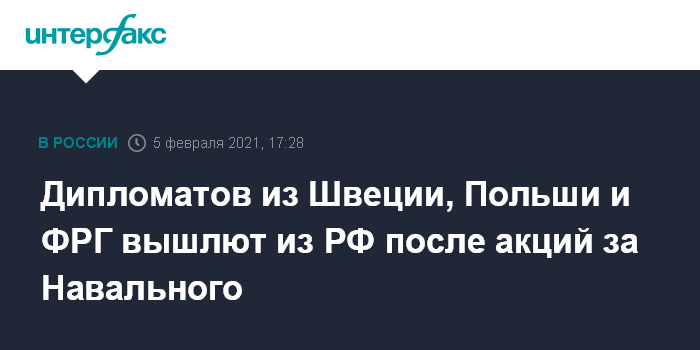 Москва. 5 февраля. INTERFAX.RU - МИД России объявил personaе non grataе дипломатов из Швеции, Польши и Германии, которые участвовали в Петербурге и Москве в акциях в поддержку Алексея Навального 23 января. Их высылают из России, говорится в сообщении ведомства.