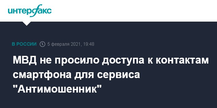 Москва. 5 февраля. INTERFAX.RU - В МВД отрицают, что собирались дополнить мобильное приложение "Антимошенник" возможностью доступа к телефонным книгам и контактам пользователей смартфона.