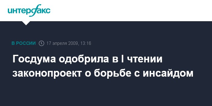 Москва. 17 апреля. INTERFAX.RU - Госдума приняла в первом чтении законопроект "О противодействии неправомерному использованию инсайдерской информации и манипулированию рынком". Документ был внесен в Думу правительством РФ в декабре 2008 года.