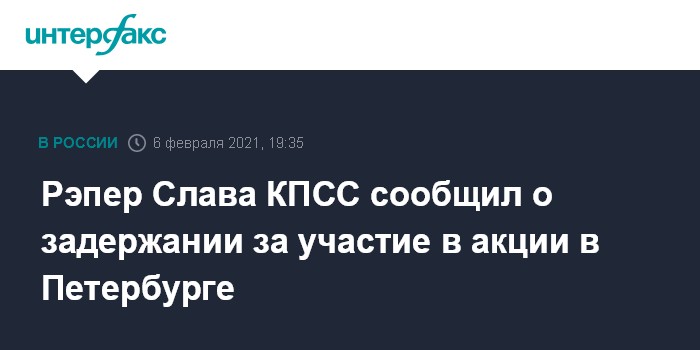 Москва. 6 февраля. INTERFAX.RU - Рэпер Слава КПСС (Вячеслав Машнов) сообщил о задержании за участие в несанкционированной протестной акции в Санкт-Петербурге.
