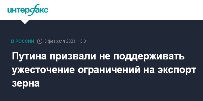 Москва. 8 февраля. INTERFAX.RU - Российский зерновой союз подготовил обращение к президенту РФ Владимиру Путину, в котором просит его не поддерживать ужесточение ограничений на экспорт зерна из РФ и ограничить действие уже введенных мер текущим сельскохозяйственным сезоном (заканчивается 30 июня 2021 года).