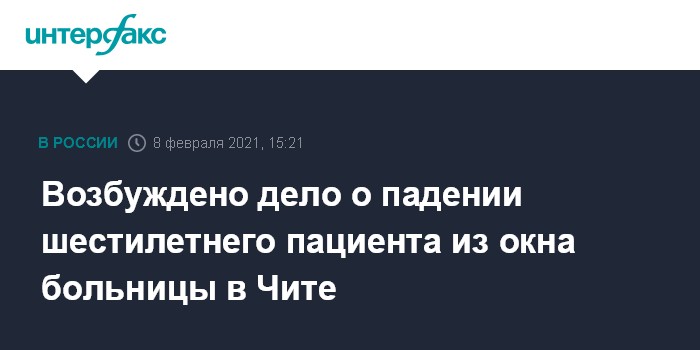 Москва. 8 февраля. INTERFAX.RU - В Чите возбуждено уголовное дело после того, как из окна третьего этажа краевой детской клинической больницы выпал шестилетний пациент и с травмами попал в реанимацию, сообщили в СКР. Дело возбуждено по ч. 2 ст. 293 УК (халатность, повлекшая по неосторожности причинение тяжкого вреда здоровью человека).