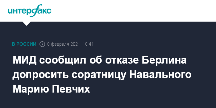 Москва. 8 февраля. INTERFAX.RU - В Германии прокуроры отказались опросить сотрудницу Фонда борьбы с коррупцией (ФБК, признан в России иностранным агентом) Марию Певчих по просьбе Генпрокуратуры России. Германская сторона указала, что ее адрес в ФРГ "якобы неизвестен", сообщила представитель МИД Мария Захарова.